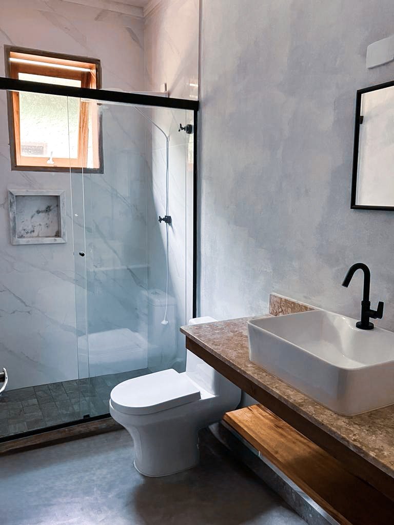 A sala de estar combina o charme bruto do piso de cimento queimado com o calor acolhedor da lareira a lenha. Uma TV de tela plana está fixada num painel de madeira de demolição, criando um ponto focal moderno. O sofá de três lugares em linho cru acomoda confortavelmente os moradores, enquanto duas poltronas de vime arco proporcionam um toque leve e natural. Grandes janelas de vidro enquadram a mata atlântica, filtrando a luz do dia e projetando sombras suaves sobre o ambiente.